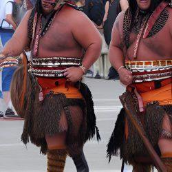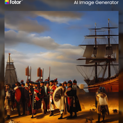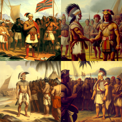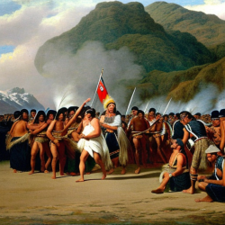 The images below were created in response to the text: “Captain Cook’s ship Endeavour arriving in New Zealand and being greeted by Māori warriors”. You can see that the AI’s understanding of what “Māori” means is somewhat limited. Some of them entirely avoided any attempt at Māori warriors and instead focussed on better-understood European clothing or South American tribal regalia.