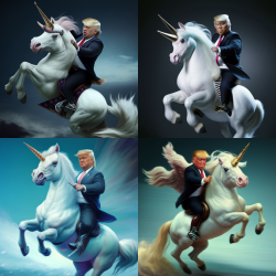 Text-to-image AI generators do not “steal” existing art in the traditional sense. The images generated by these models are not exact copies of existing art, but rather, they are new images created based on the model’s understanding of the text description provided. In a way, this is exactly what a human artist does when asked to create an image. If they didn’t know who Donal Trump was or what a Unicorn looked like, how could they create an image of “Donald Trump riding a Unicorn”? (Note: This image request was blocked by a couple of the AIs!)
